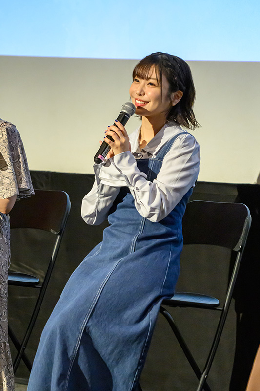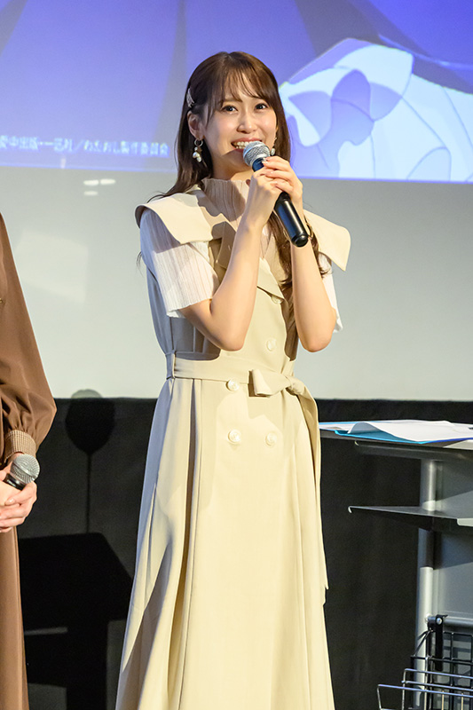 大きな拍手で迎えられた4人は、さっそく3話までのアニメの感想を話していく。「シリアスとわちゃわちゃの緩急がすごい!OPテーマから『わた推し』ワールド全開で、そこでグッと持っていかれました」と奈波さん。続いて、「(レイとクレアのやり取りに)ニヤニヤしっぱなしですよね!これがずっと続くのだから、毎週癒やされるなって思いました」と愛美さんが言うと、「続くといいよね~」と、どこからか意味深な発言も……。長谷川さんは「アフレコのときから映像ができていたので、見ていて懐かしさがあったんですけど、OPとEDは初めて見たんです!テンションが上がる素敵な歌でした」と、レイとクレアが歌うOP/EDテーマを絶賛していた。